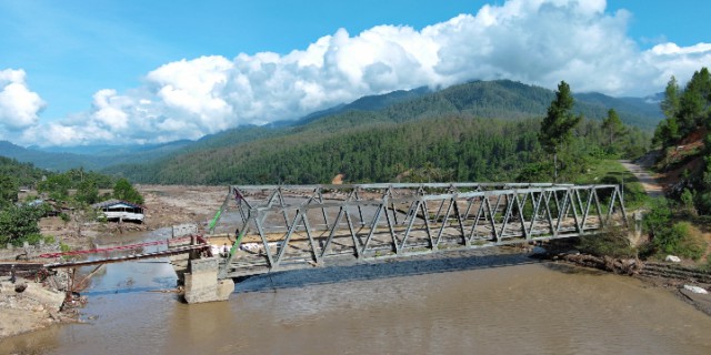 BNPB menyebut pembangunan jembatan bailey masih terus diupayakan. Namun, pengangkutan peralatan terkendala kondisi akses darat menuju lokasi yang belum sepenuhnya terbuka.