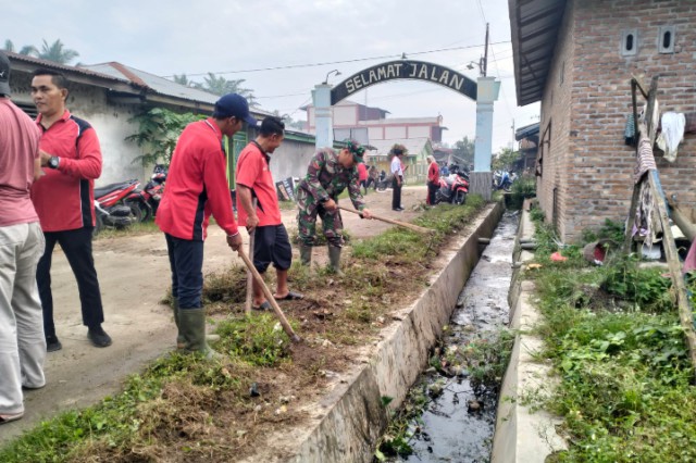 Dalam kegiatan tersebut, Babinsa bersama masyarakat setempat bergotong royong membersihkan parit di sekitar permukiman warga dan sepanjang jalan desa dari tumpukan sampah.