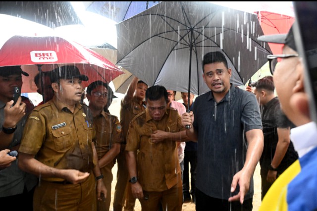 Permintaan itu disampaikan Bobby saat meninjau langsung pembangunan tanggul dan sabodam di Desa Hutanabolon, Senin (13/4/2026), di tengah hujan deras.