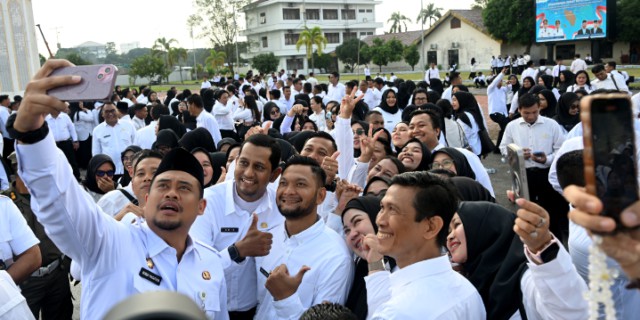 Foto:Gubernur Sumatera Utara Muhammad Bobby Afif Nasution berfoto bersama guru PPPK paruh waktu setelah apel penyerahan surat keputusan pengangkatan di Lapangan Astaka, Jalan Pancing, Deliserdang, beberapa waktu lalu.(ist)