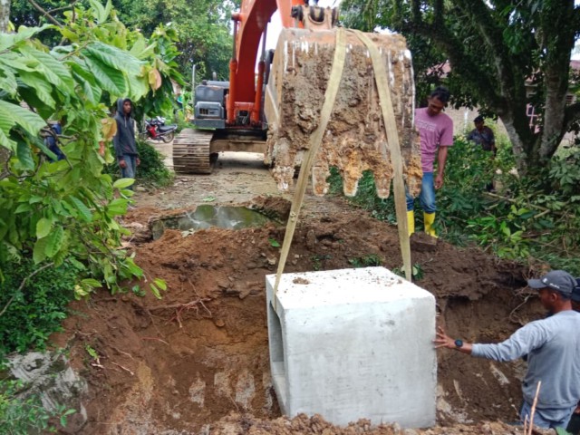 Di lokasi, tampak personel Satgas TMMD bekerja sama dengan operator alat berat (eskavator) untuk mengangkat dan menempatkan gorong-gorong beton siap pakai ke dalam galian parit.
