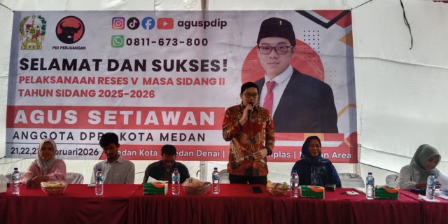 MEDAN, Menarapos.id – Ratusan warga menghadiri Reses V Masa Sidang II Tahun 2025–2026 yang digelar Anggota DPRD Kota Medan, Agus Setiawan, di Jalan Samarinda, Kelurahan Mesjid, Kecamatan Medan Kota, Sabtu, 21 Februari 2026.