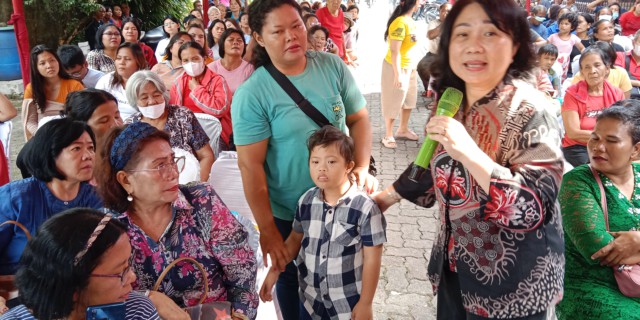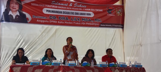 Anggota DPRD Medan Dr Lily saat menyapa warga dalam pelaksanaan Sosperda No.2 Tahun 2024 Tentang Perlindungan Disabilitas dan Lanjut Usia yang berlangsung di Jalan Pantai Timur, Kelurahan Cinta Damai, Medan Helvetia (Komplek Taman Hako Indah)