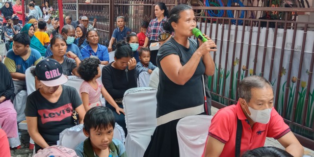 Erni seorang tuna netra menyampaikan permohonan bantuan yang belum diterimanya saat Sosialisasi Perda Kota Medan No.2 Tahun 2024 Tentang Perlindungan Disabilitas dan Lanjut Usia yang berlangsung di Jalan Pantai Timur, Kelurahan Cinta Damai, Medan Helvetia (Komplek Taman Hako Indah) (Amsal)