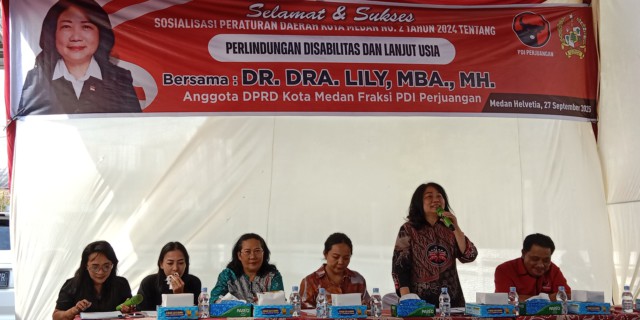 Anggota DPRD Medan Dr Lily saat menyapa warga dalam pelaksanaan Sosperda No.2 Tahun 2024 Tentang Perlindungan Disabilitas dan Lanjut Usia yang berlangsung di Jalan Pantai Timur, Kelurahan Cinta Damai, Medan Helvetia (Komplek Taman Hako Indah)