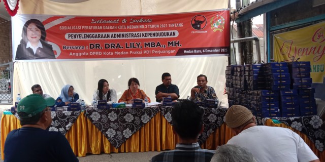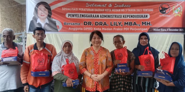 MEDAN, Menarapos.id – Anggota DPRD Medan Dr Dra Lily MBA MH melaksanakan Sosialisasi Perda Kota Medan No.3 Tahun 2021 tentang penyelenggaran Administrasi kependudukan, yang dihadiri ratusan peserta di Jalan S.Parman Gang Pasir Kelurahan Petisah Hulu, Kecamatan Medan Baru, Sabtu (06/12/25).