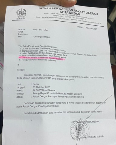 Mengenai undangan Rapat Dengar Pendapat (RDP) diterima GPMI Kota Medan pada 1 Oktober 2025 dengan Nomor Surat : 400.16.6/3865 yang langsung ditandatangani Ketua DPRD Medan Wong Chun Sen, sebut Sekretaris GPMI Kota Medan Otti Batubara kepada wartawan Minggu (05/10/25).