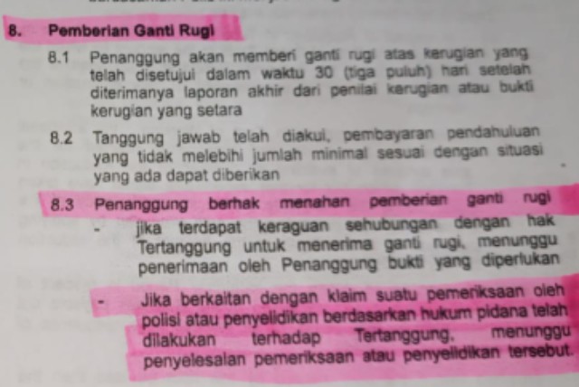 Sementara Pasal 8.3 menyatakan apabila klaim berkaitan dengan pemeriksaan oleh polisi atau proses hukum pidana, penanggung dapat menunda pembayaran sampai pemeriksaan tersebut selesai.