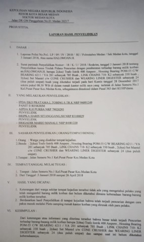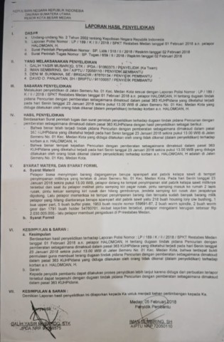 Dalam LHP berdasarkan Laporan Polisi Nomor: LP/189/K/II/2018/SPKT Restabes Medan tanggal 1 Februari 2018 atas nama pelapor Halomoan H, penyidik menyimpulkan telah terjadi dugaan tindak pidana pencurian dengan pemberatan sebagaimana dimaksud dalam Pasal 363 KUHP.