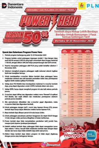 MEDAN, Menarapos.id – Dalam semangat memperingati Hari Pahlawan, PT PLN (Persero) Unit Induk Distribusi (UID) Sumatera Utara mengajak masyarakat untuk memanfaatkan program “Power Hero”, promo spesial tambah daya listrik dengan diskon 50% bagi seluruh pelanggan rumah tangga 1 fasa.