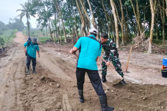 Seluruh personel dan warga bekerja ekstra, menggunakan cangkul dan alat sederhana untuk meratakan dan membersihkan sisa-sisa batu yang dapat mengganggu kenyamanan berkendara.