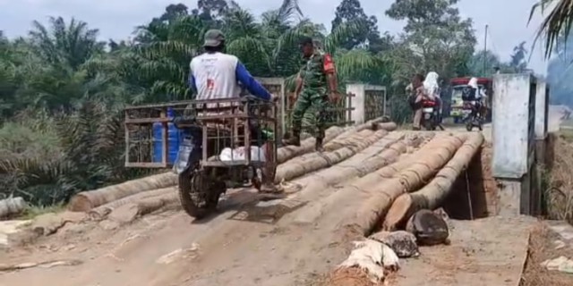 Petugas Babinsa melakukan monitoring di lokasi dan berkoordinasi dengan perangkat desa untuk penanganan darurat. Upaya sementara dilakukan dengan memasang enam batang pohon kelapa yang diperkuat papan setebal 6 cm sebagai jembatan darurat. Jalur tersebut dapat dilewati sepeda motor dengan cara didorong, sementara mobil pribadi dapat melintas pada sisi kiri dan kanan.