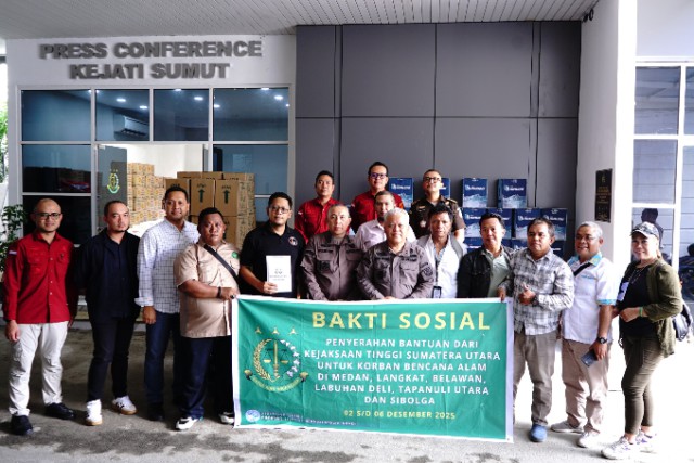 MEDAN, Menarapos.id — Kepala Kejaksaan Tinggi Sumatera Utara, Harli Siregar, menyerahkan bantuan sosial bagi masyarakat dan awak media yang terdampak bencana alam di sejumlah wilayah Kota Medan. Penyerahan berlangsung secara simbolis di ruang press room Kejati Sumut.