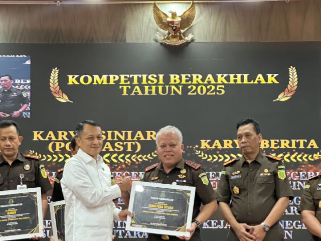 MEDAN, Menarapos.id — Kejaksaan Tinggi Sumatera Utara (Kejati Sumut) meraih peringkat ketiga dalam Kompetisi Satuan Kerja Ber-AKHLAK 2025. Penghargaan tersebut diserahkan oleh Wakil Jaksa Agung Republik Indonesia melalui Jaksa Agung Muda Pengawasan (Jamwas) Rudi Margono dan diterima langsung oleh Kepala Kejati Sumut, Harli Siregar, di Jakarta, Rabu, 17 Desember 2025.
