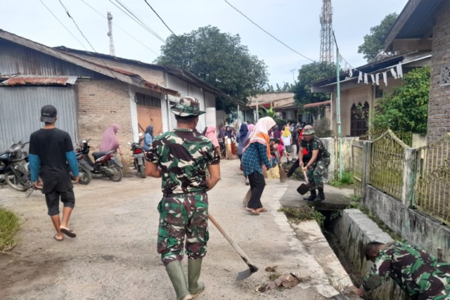 Dalam suasana gotong royong, anggota Satgas TMMD dan warga desa bahu-membahu membersihkan parit. Prajurit terlihat menggunakan cangkul dan sekop untuk mengeruk lumpur dan sampah, sementara warga membantu merapikan hasil galian.