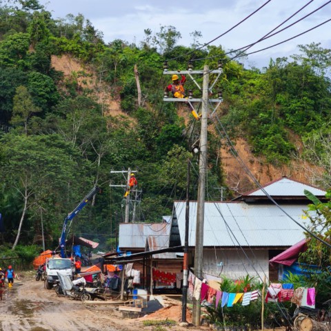 Teks : Petugas PLN sedang memperbaiki konstruksi jaringan listrik di Desa Lubuk Sibuk, Kuala Simpang, Aceh Tamiang. Jaringan listrik ini merupakan salah satu yang terdampak oleh banjir dan tanah longsor yang sempat melanda wilayah tersebut. (ist)