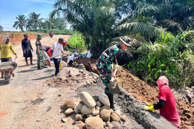 Terlihat di lokasi, anggota Satgas TMMD bersama warga bahu-membahu merapikan sisi jalan dan menyusun batu-batu untuk membentuk struktur tanggul, sebuah upaya yang memerlukan tenaga dan kesabaran.