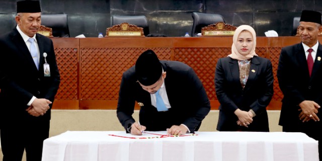 Teks foto: Gubernur Sumut Bobby Nasution menandatangani pengesahan Ranperda APBD Sumut TA 2026 sebesar Rp11,673 triliun menjadi Perda, disaksikan Ketua DPRD Sumut Erni Aryanti Sitorus serta Wakil Ketua DPRD Sutarto, Ihwan Ritonga, dan Salman Alfarisi, Jumat (28/11/2025) di DPRD Sumut. (Ist)