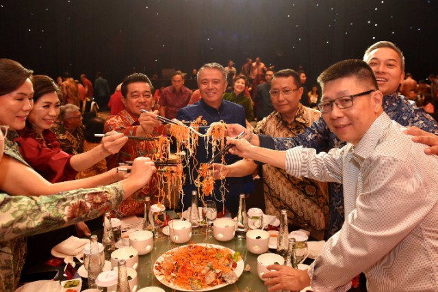 Teks: KOMPAK BERSAMA NASABAH. Komisaris Independen PT Bank Tabungan Negara (Persero) Tbk Panangian Simanungkalit, Wakil Direktur Utama Oni Febriarto Rahardjo, dan Direktur Network & Retail Funding Rully Setiawan tersenyum bersama nasabah saat tradisi Yusheng dalam BTN Economic Outlook & Chinese New Year 2026 di Surabaya, Kamis (26/2). BTN mencatat pertumbuhan double digit bisnis wealth management di Surabaya dan menyiapkan layanan baru consumer banking, termasuk kredit modal kerja dan KUR untuk mendukung pengembangan usaha nasabah.(ist)