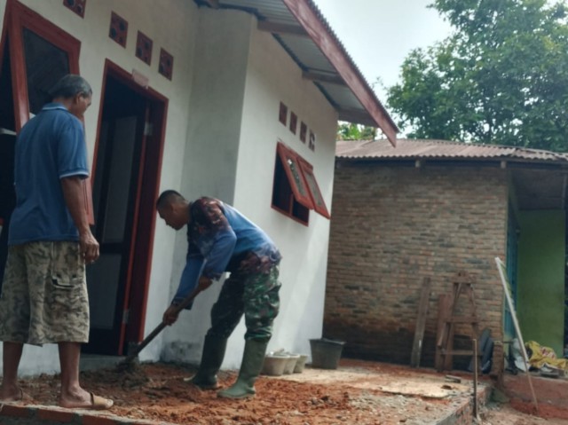 Pada hari ini, Minggu (26/10/2025), personel Satgas TMMD terlihat bekerja sama dengan Bapak Ediyan (atau perwakilan warga) melaksanakan penimbunan teras depan rumah.