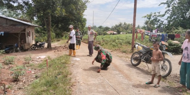 Di lokasi yang masih berupa jalan tanah dan berlumpur, terlihat sejumlah personel Satgas TMMD bekerja dengan alat ukur dan pita meter. Mereka memastikan bahwa jalur jalan yang akan dibangun benar-benar sesuai dengan perencanaan awal agar tepat sasaran dan memberikan manfaat maksimal.