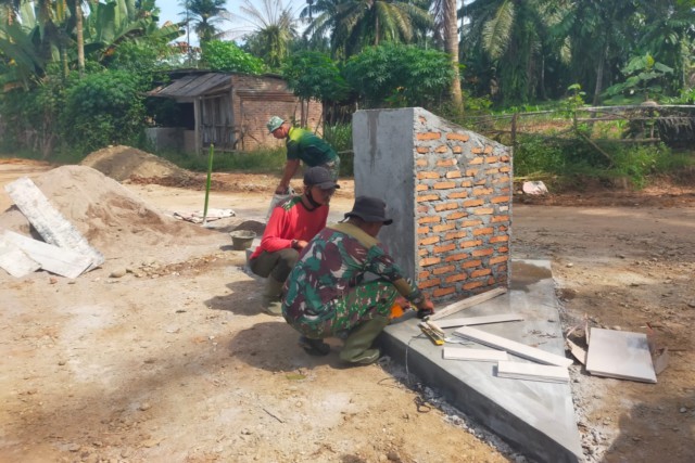 Pembangunan tugu prasasti kini telah memasuki tahap krusial, yaitu pemasangan keramik. Setelah fondasi tugu dibangun dengan susunan bata merah, personel Satgas terlihat teliti dan fokus merapikan permukaan tugu dengan lapisan plester dan keramik.