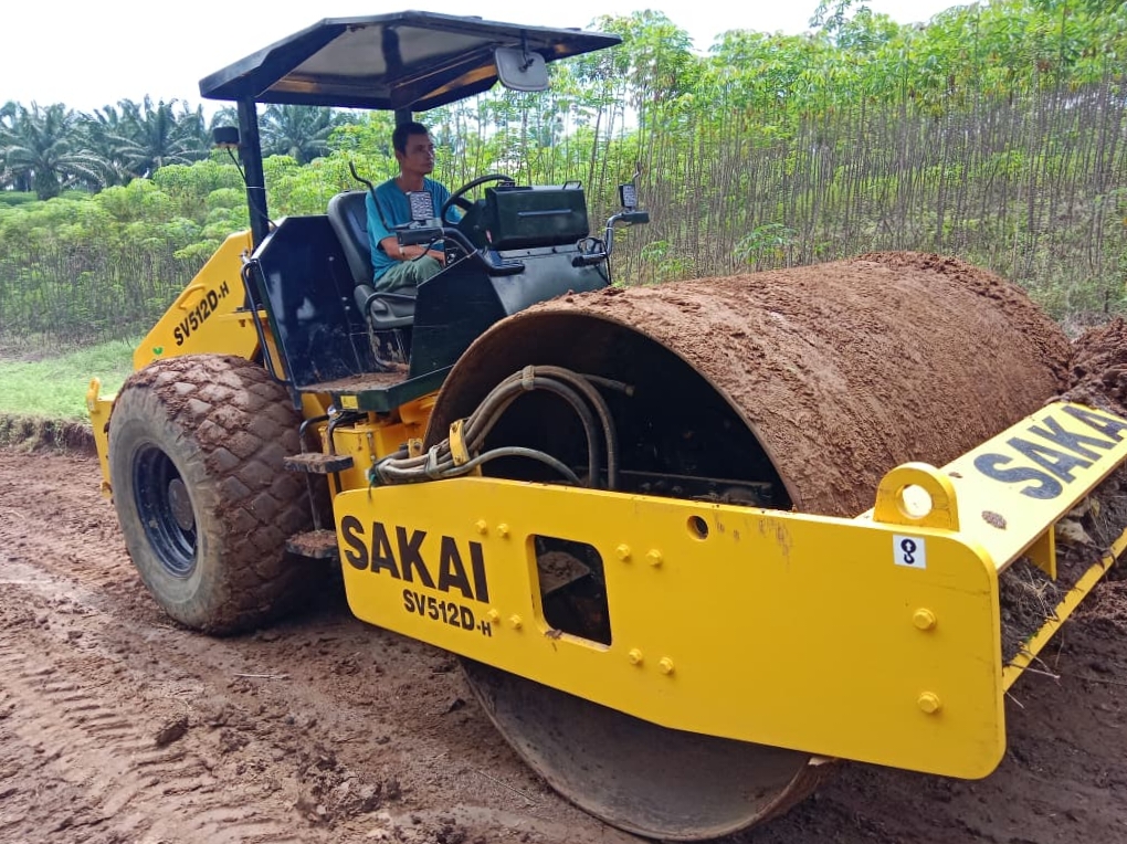 Tampak operator alat berat dengan teliti memadatkan tanah yang sebelumnya sudah diratakan oleh grader. Pemadatan ini bertujuan menghilangkan rongga udara pada tanah dan memastikan kepadatan optimal, sehingga badan jalan siap menerima beban lalu lintas dan tahap perkerasan dengan sirtu.