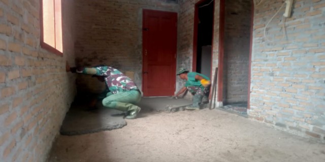 Terlihat di lokasi RTLH, personel Satgas TMMD dengan teliti mengaduk material semen dan pasir, kemudian meratakan campuran tersebut di atas permukaan lantai. Ketekunan para prajurit menunjukkan komitmen mereka untuk memberikan kualitas terbaik pada setiap detail pembangunan.