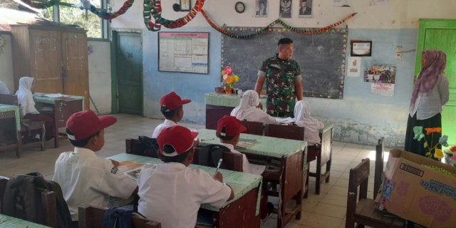Serda A Jailani, salah satu personel Satgas TMMD, terlihat mengambil peran sebagai guru dadakan. Ia berinteraksi langsung dengan para pelajar SD di ruang kelas.