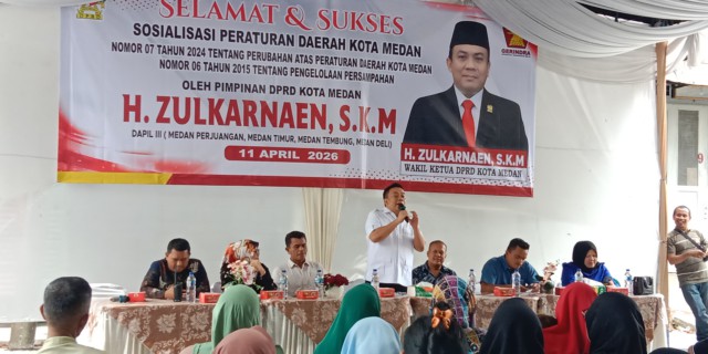 MEDAN, Menarapos.id – Pimpinan DPRD Kota Medan, H Zulkarnaen, melaksanakan sosialisasi Peraturan Daerah (Sosperda) Kota Medan Nomor 07 Tahun 2024 tentang perubahan atas Perda Nomor 06 Tahun 2015 mengenai pengelolaan persampahan. Kegiatan ini digelar di Jalan Bandar Baru, Kelurahan Sidodadi, Medan Timur, Sabtu (11/4/2026).