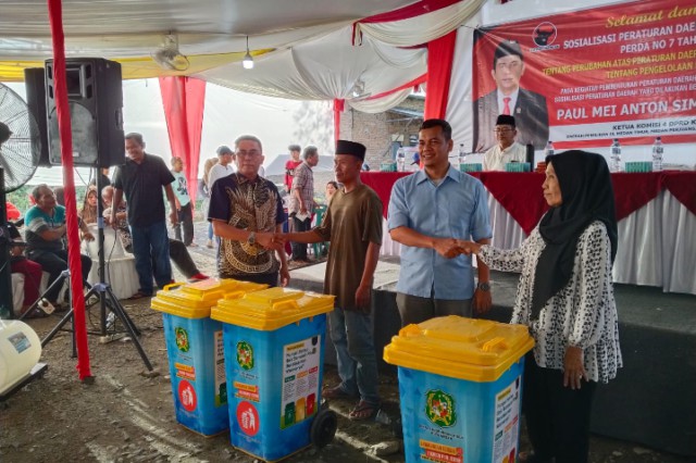 Diakhir acara sosialisasi tersebut, Paul menyerahkan Tiga Bak Sampah kepada perwakilan warga. (rel)